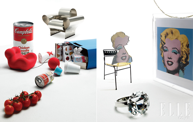 Pop Necklace 앤디 워홀은 물건에 집착했다. 뉴욕에 있는 그의 4층짜리 집에는 택시 영수증부터 610개에 달하는 문서 상자, 공예품과 골동품 옷가지로 가득했다. 의자에서 두루마리 화장지, 키홀더와 탁상시계까지. 물건의 홍수 속에서 누구나 달러만 손에 쥐면 이 수집벽에 동참할 수 있다. (왼쪽부터) 스틸 네이키드(naked) 체어는 웰즈 제품으로 1백26만원. 바나나 모형의 인테리어 스티커 ‘웁스’는 각기 다른 바나나 프린트 2장이 한 세트로 레이블럭에서 판매하며 5천원. 100달러가 프린트된 두루마리 휴지는 호사컴퍼니에서 판매하며 9천원. 노란색 커피 테이블은 메튜 마떼고의 작품으로 aA뮤지엄에서 판매하며 가격 미정. 등받이가 트위스터로 되어 있어 움직임이 편한 트위스트 암체어는 웰즈 제품으로 2백90만원. 조지 넬슨이 디자인한 빨간 시계 ‘세라믹 클락 No.1’은 비트라에서 판매하며 54만원. 골드빛 체인 네크리스는 도데카에서 판매하며 가격 미정. 열쇠 모양 키링은 도데카에서 판매하며 2만6천원. |