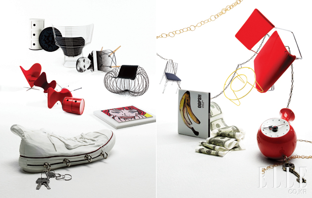 My Factory 앤디 워홀은 자신의 작업실을 팩토리라고 불렀다. 공장에서 코카콜라 병이 쏟아지듯 예술 작품을 찍어낸다는 의미. 일령종대로 컨베이어 벨트 위를 흐르는 제품, 아이디어 그리고 일상의 시간들. (왼쪽 위부터) 흰색 ‘컴포니빌리(componibili)’ 수납장은 카르텔 제품으로 가격 미정. 검정색 상판의 사이드 테이블 ‘타페테(Tapete)’는 웰즈 제품으로 71만원. 톰 딕슨의 와이어 체어는 aA뮤지엄에서 판매하며 가격 미정. 트위기의 얼굴이 프린트된 의자는 ‘도트 맨’ 시리즈이며 30개 한정 리미티드 에디션으로 레이블럭 제품. 37만원. 검정색 와이어 체어는 디자이너 재하의 작품으로 가격 미정. 붉은색 하트 콘 체어는 베르너 팬톤의 작품을 미니어처로 만든 것으로 비트라에서 판매하며 50만원. 프리츠 한센의 세븐 시리즈 체어(자주색, 붉은색)는 인엔에서 판매하며 가격 미정. 빨간색 서랍장 ‘컴포니빌리’는 카르텔에서 판매하며 가격 미정. 로이 리히텐슈타인의 작품 ‘행복한 눈물’은 스타일리스트 소장품. 캔버스화 키홀더는 마커스 아다마스에서 판매하며 12만원.