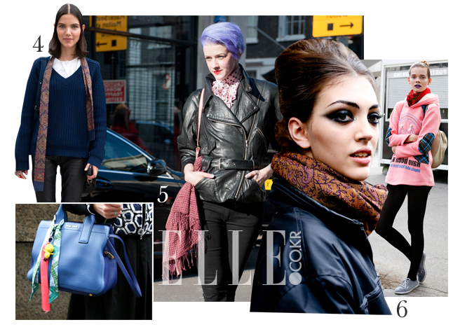 5 얇고 긴 타이 스카프는 크기에 부담 없이 색다른 변신이 가능한 액세서리다. 가령 가방에 디자인 또는 컬러를 믹스해 키링과 함께 연출하거나 프린지가 늘어진 스카프를 가방에 묶어 미니멀한 디자인에 포인트를 줄 수 있다.