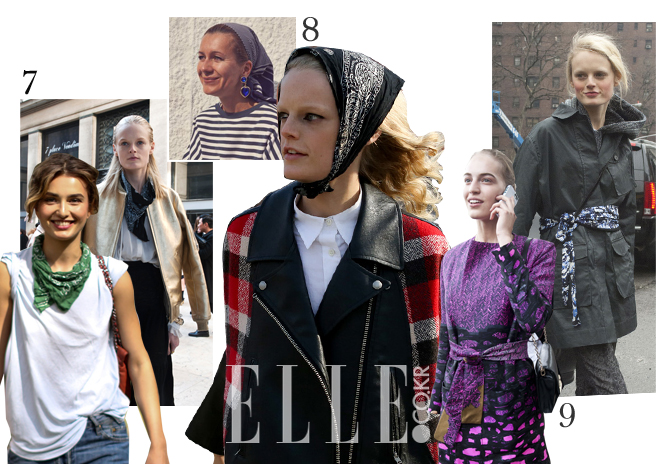 10 스카프를 돌돌 말아 길게 만든 다음 머리 중앙부분에서 서로 교차시켜 머리 뒤로 매듭지으면 개성만점 헤어밴드가 완성된다. 긴 헤어스타일에 스카프를 이마에 감싸면 그런지 무드를 낼 수 있다.