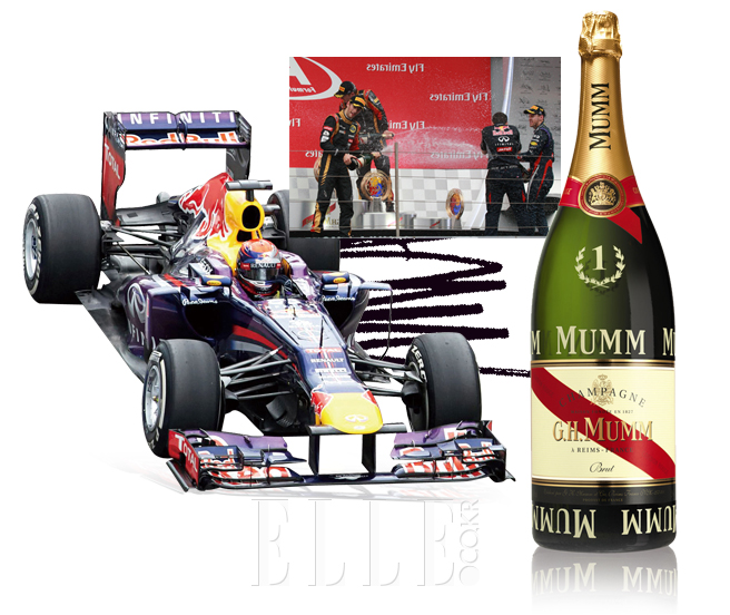 전남 영암에서 펼쳐진 F1 경기 결승전. 그린 시그널이 켜지고 예선 성적순으로 출발해 서킷을 내딛은 머신들은 난생처음 들어보는 굉음과 지축을 뒤흔드는 진동을 내뿜으며 약 2시간 동안 레이스를 펼쳤다. 100억원에 가깝다는 머신들이 총알처럼 날아다니는 현장이 눈앞에 펼쳐졌음에도 불구하고 비현실적이었는데, 레드불 세바스찬 베텔의 독주와 맥클라렌 세르히오 페리즈의 타이어 펑크, 레드불 마크 웨버의 머신 화염 사고, 자우버의 니코 휼켄베르크의 디벤스 등의 광경을 VIP 페덕 클럽에서 보고 있다는 점도 마찬가지였다. 결국 독보적인 우위를 점한 베텔이 4회 연속 영암의 그랑프리 챔피언의 영예를 안고 포디엄의 가장 높은 자리에 섰다. 그리고 그는 우승 트로피에 이어 월계관과 챔피언을 상징하는 숫자 ‘1’이 새겨진 3000ml 꼬르동 루즈(G.H.MUMM Cordon Rouge) 보틀을 동료들을 향해 흩뿌렸다. 55바퀴, 5000km가 넘는 질주 이후의 축배, 샴페인의 보글보글한 기포가 경이로운 레이서들의 열정을 적시던 풍경 역시 너무 비현실적이어서 환상 동화를 한 편 본 기분이다.