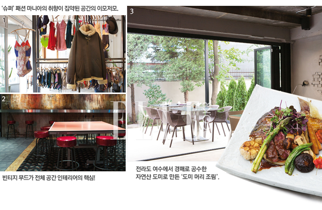 1 엘레펀트 & 캐슬 자체 브랜드 ‘엘레펀트 & 캐슬’ 외에 전 세계 곳곳에서 ‘바잉’해 온 아이템을 함께 선보이는 중. 자카르타에서 수입해 온 패브릭, 영국에서 가져온 ‘도어 노브’와 초기 디자인의 버버리 트렌치코트, 벨벳으로 만든 빈티지풍 하이웨이스트 수영복 등 여자라면 훔쳐 오고 싶은 아이템이 잔뜩 도배돼 있어 쉽게 빠져 나오기 힘들다. add 용산구 한남동 738-7