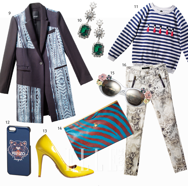 14 지브라 패턴이 컬러를 덧입었다. 블루와 브라운의 조화가 화려한 사각 클러치백. 가격 미정, 비비안 웨스트우드.