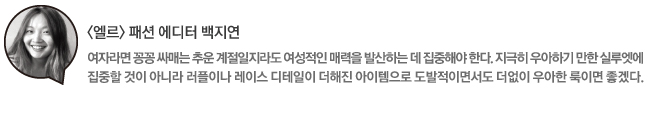 1 스모킹 디테일에서 페미니티가 묻어나는 니트 원피스. 79만5천원, 마인.