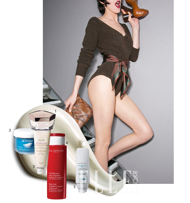 보드라운 피부 결과 탄력 있는 보디라인을 위한 첫걸음은 보습. 욕실에서 나오기 전 보디 크림을 꼼꼼히 바르되 무릎이나 팔꿈치처럼 심하게 건조하고 주름진 부위는 유분기 있는 제품을 충분히 도포하길. 셀룰라이트는? 슬리밍 제품과 함께 손으로 마사지하고 이왕이면 아픈 부위를 꾹꾹 눌러 뭉친 근육까지 풀어주는 것이 좋다. 주사로 지방을 분해하는 ‘PPC’와 ‘LLD’, 기계를 이용한 ‘젤틱’과 ‘리포소닉’ 역시 매끈함을 되살리는 체형 윤곽술로 성행 중이다.