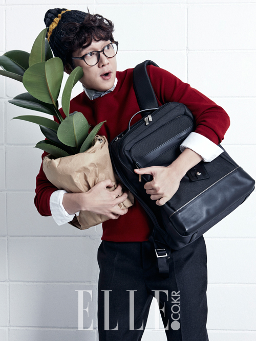 내부에 노트북과 아이패드 슬리브가 있어 실용적인 트루디 백팩은 Samsonite. 화이트 셔츠는 Jil Sander. 레드 니트 톱과 그레이 팬츠는 모두 Burberry Prorsum. 니트 비니는 Fred Perry.