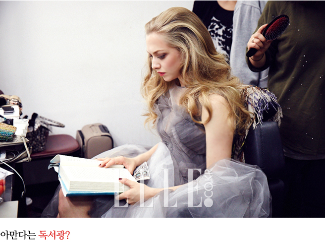 헤어 메이크업 중에도 손에서 책을 놓지 않는 아만다 사이프리드. 그녀가 읽고 있는 저 두꺼운 책은?