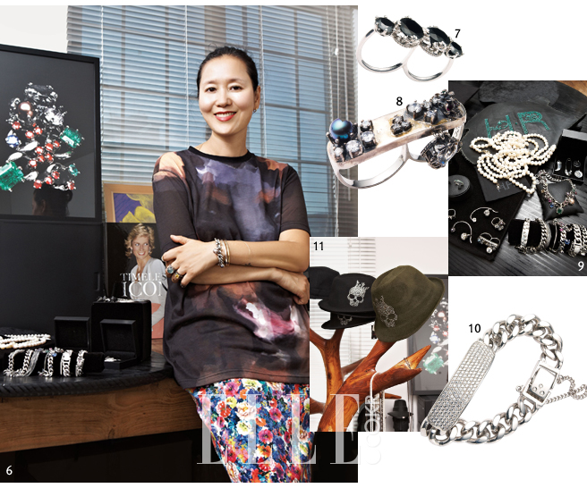 원래 주얼리나 다른 액세서리에 관심이 많은 편이었나 지금은 직업상 홍보를 위해서라도 귀고리, 목걸이, 팔찌, 반지를 조금씩 연출하는데 원래는 반지도 잘 안 끼는 스타일이었다. 하지만 소장하는 의미로 다양한 주얼리 컬렉션을 사 모았다. 슈즈도 좋아한다. 옷의 경우 굳이 디자이너 브랜드가 아니어도 아메리칸 어패럴 V네크라인 티셔츠 하나만 있어도 잘 입고 다니는 편이다. 5년 전까지만 해도 클럽에서 발이 퉁퉁 부어도 힐을 신었는데 요즘엔 스니커즈가 제일 좋다. 직접 오더해서 구입할 만큼 나이키 마니아이기도 하고 루디 데이비스도 좋아한다. 개인적으로 가장 애착이 가는 HR 피스는 HR의 시그너처인 체인 시리즈가 가장 좋다. 공장에서 그냥 찍어 놓은 체인이 아니라 모두 산소 용접을 해서 체인을 완성한 것이 가장 큰 특징이다. 체인에 뭔가 검게 묻어 있기도 하는데, 코스튬 주얼리인데도 독특한 날것 느낌이 좋다. 너무 예쁘게 정돈되고 비율이 맞는 것보단 거칠고 손을 탈수록 아름다워지는 게 HR의 매력이다.