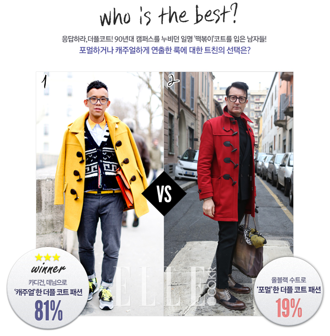 @Seol_A_K 2번. 노란색을 무지 좋아해서 2번 룩에 눈길이 가네요. 더플 코트는 영하고 밝게 연출하는 게 좋더라고요. 젊으니까 밝고 통통 튀는 느낌으로 캐주얼하게 연출하는 것을 추천해요!