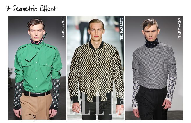 반팔로 된 폴로 셔츠나 체크 셔츠를 소매가 긴 티셔츠와 레이어드한 스타일이 대두되던 90년대. 현재라면 얼토당토않은 패션 스타일링이지만 그 당시엔 선풍적인 인기를 끌던 트렌디한 ‘옷 맵시’였다. 지금까지도 환절기와 겨울철에 적극 활용되는 레이어링 패션. 90년대 레이어링의 ‘촌티’를 싹 벗기고 현대적인 무드로 재충전하고 싶다면? 미래적인 분위기의 ‘기하학적 패턴’이 답이다(체크는 금물). 지그재그나 선 등의 반복적인 무늬가 이너웨어나 셔츠의 칼라 또는 의상 전체에 더해져 모던한 분위기로 업 시킬 것. 베이스볼 점퍼나 포멀한 재킷에도 응용해보자.