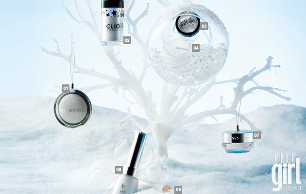 1 브러시에 물을 묻혀 사용하면 메탈릭한 화이트 컬러를 표현할 수 있는 다이아몬드 섀도 01호. 2.5g. 2만8천원. 비디비치 by 이경민. 2 눈꼬리, 쇄골, 머리카락 등에 사용하면 화려한 이미지를 연출할 수 있는 글리터즈. 5호. 4.7g. 1만2천원. 클리오. 3 눈, 볼, 입술은 물론 보디 피부에도 사용가능한 다이아몬드 파우더 01호. 2g. 3만4천원. 메이크업포에버. 4 밀착력이 우수하며 생기있는 피부를 연출해주는 쥬얼 파우더 WH002호. 1.5g. 4천9백원. 더페이스샵. 5 팁이 내장된 가루 타입 섀도로밀착력과 발림감, 반짝임이 뛰어난 더 스타일 다이아 펄 아이즈 WH01호. 2.2g. 6천8백원. 미샤. 6 매트와 펄, 두 가지 질감의 화이트 펜슬이 달려있어 하이라이트 효과를 주기에 적합한 아이 라이트 펜슬. 2.6g. 2만6천원. 슈에무라. 7 촉촉하고 말랑말랑한 크림 타입 아이섀도로 부드럽게 발리며 지속성이 뛰어난 젤리 아이 컬러 01호. 6g. 3만9천원. 질스튜어트. |