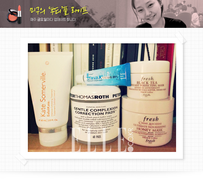 요즘 에디터가 사용하고 있는 몇 가지 에센셜 아이템을 공개한다. 내 경우 각질제거는 화학적, 물리적 필링 두 가지를 번갈아 가며 한다. 가장 왼쪽의 케이스 서머빌 엑스폴리케이트 인텐시브 엑스폴리에이팅 트리트먼트는 엔자임과 스크럽이 함유돼 마치 에스티텍 케어를 바른 듯 순식간에 피부가 매끈해지는 제품. 단 약간 자극적일 수 있으니 예민한 피부는 조심해서 사용해야 한다. 스티바 A연고는 이미 ‘안티에이징 연고’로 입소문난 제품으로 피부과 처방전이 필요한 제품. 단독으로 여드름이 난 부위에만 사용해도 되고 수분 크림에 살짝 섞어 사용한다. 피터토마스로스의 젠틀 컴플렉션 코렉션 패드는 일주일에 3번 정도 저녁 스킨케어때 사용하면 각질이 쌓일 틈을 안 준다. 그 덕에 좁쌀 여드름에도 특효약. 아쉽게도 국내 미출시.