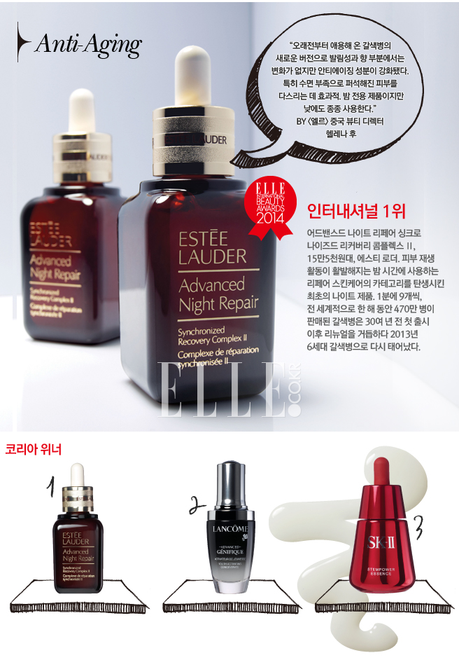 1위 어드밴스드 나이트 리페어 싱크로나이즈드 리커버리 콤플렉스 Ⅱ, 15만5천원대, 에스티 로더. 이미 업계의 전설이 된 부동의 베스트셀러. 초기 노화를 지연시키는 데 탁월한 효과를 발휘하고 피부가 어려지는 느낌이 들며 잠을 푹 잔 듯 생기 있어 보인다.