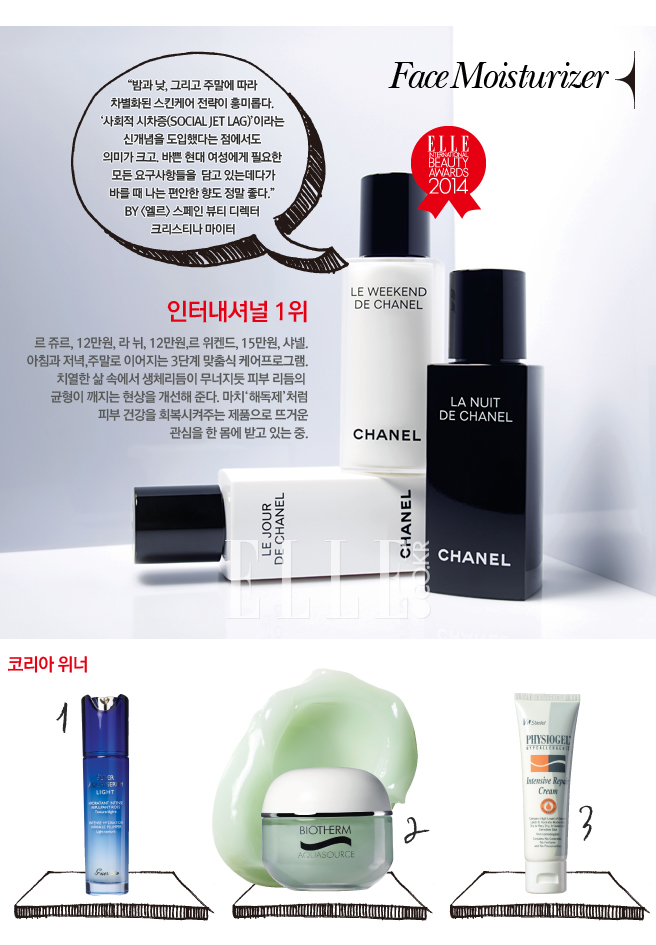 2위  아쿠아수르스 3.0 수분크림, 5만4천원대, 비오템. 전 세계에서 7초에 한 개씩 판매되는 수분 크림으로 29회의 수상 경력을 지니고 있다. 보습이라는 기본에 충실하며 진정 효과도 높은 편. 한번 쓰기 시작하면 멈출 수 없는 상쾌한 젤 포뮬러 역시 인기 요인이다.