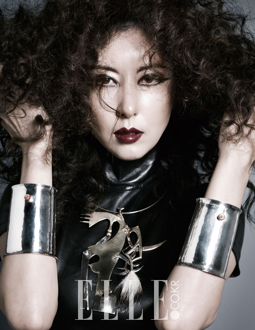 관록의 디바, 김완선의 섹시한 카리스마를 증폭시켜 주는 볼드한 팔찌는 ‘행성 시리즈’로 유명한 미국 화가 제임스 브라운의 작품, 목걸이는 쿠바가 낳은 세계적인 화가 윌프레도 람의 작품이다. 타이트한 레더 소재의 톱은 Gucci.