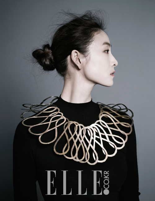 매 공연마다 ‘마지막’이라는 마음으로 임한다는 열정의 발레리나 김주원. 화장기 없는 얼굴, 기다란 목 아래에 자리한 알렉산더 칼더의 금속 목걸이가 우아한 카리스마를 더한다. 발레리나의 연습복인 니트 톱은 Repetto.