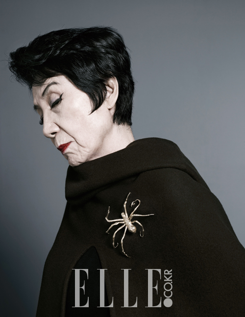 한국 패션계의 선구자인 디자이너 노라노. 그녀의 감동적인 발자취는 2013년 다큐멘터리 영화로도 만들어졌다. 태피스트리를 복원하는 일을 했던 강인한 어머니의 이미지를 투영한 루이즈 부르주아의 거미 형상의 금 브로치가 더없이 잘 어울린다. 드라마틱한 실루엣을 연출하는 케이프는 Hermes.