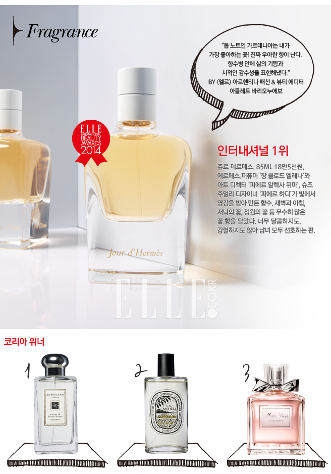 3위 미스 디올 오 드 뚜왈렛, 50ml 11만5천원, 100ml 16만5천원, 디올. 1947년에 탄생한 디올 최초의 향수, ‘미스 디올’ 라인의 오 드 뚜왈렛으로 2013년 달콤한 로즈 향이 추가되면서 전년대비3배 이상의 판매율을 올렸다. 봄기운이 느껴지는 플로럴 시프레 계열.
