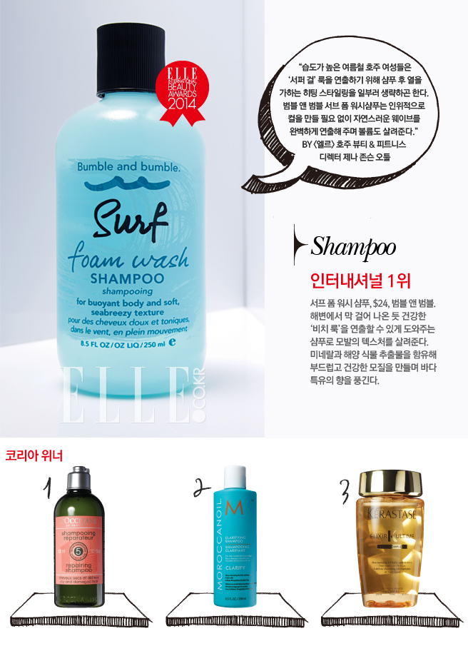 3위  엘릭서 얼팀 클렌징 오일 바스, 3만8천원대, 케라스타즈. 이미 전 세계 38개 뷰티 어워즈에서 수상한 경력이 있다. 모발을 축 처지게 만드는 실리콘을 배제해 볼륨감을 살려주는 실리콘 프리 샴푸로 최신 트렌드가 반영된 결과라고 볼 수 있을 듯. 고혹적인 향의 공도 크다.