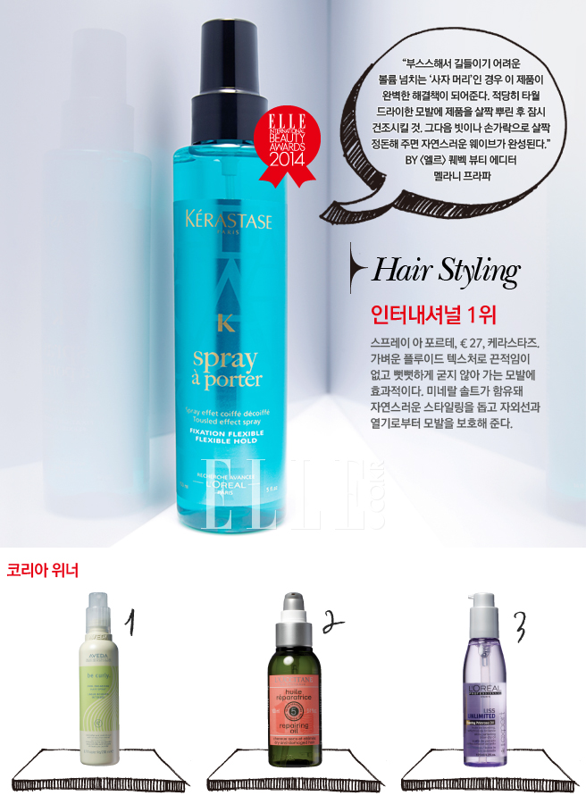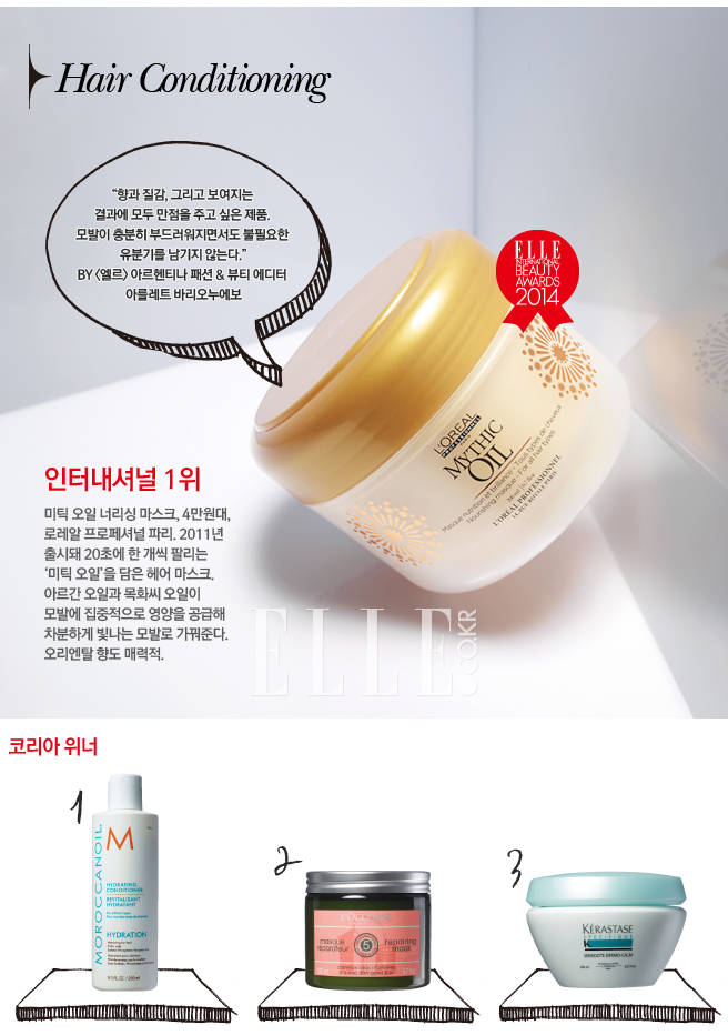 3위 리스 언리미티드 샤인 퍼펙팅 오일, 3만2천원대, 로레알 프로페셔널 파리. 뻣뻣하거나 부스스해 손질이 어려운 모발을 차분하게 만드는 제품. 최근 5년간 브랜드 헤어 케어 제품 중 매출 3위 밖으로 떨어진 적이 없으며 2013년 하반기에 습도 조절 기능이 추가됐다. 정전기가 기승을 부리는 겨울철과 환절기에 판매율이 특히 높다.