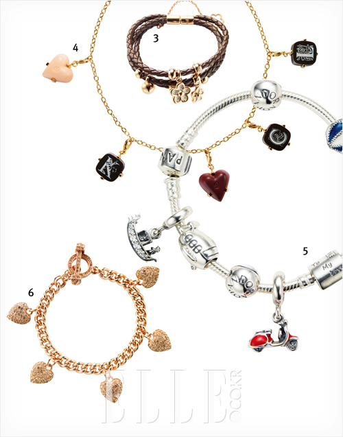 5 자그맣고 다양한 참 모형이 구매욕을 자극하는 메탈 브레이슬렛. 79만4천원, 판도라.
