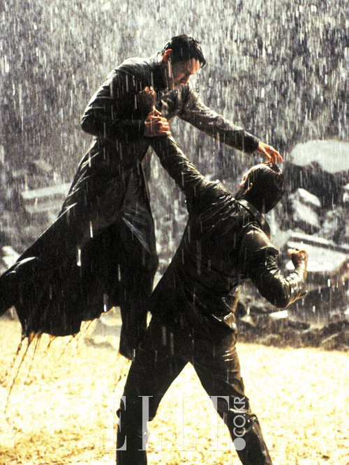 키아누 리부스 주연의 <매트릭스>에서 빗 속 격투신은 아름다운 영상미로 많은 관객들을 사로잡았다. 진지하게 대사를 주고 받는 ‘네오(키아누 리브스)’와 ‘스미스요원(휴고 위빙)’. 주먹을 불끈 쥐고 서로를 향해 돌진하며 격투를 시작한다. 격투신에 적용된 슬로우 효과는 영화의 긴장감을 높였다. 특히 이명세 감독의 국내 영화 <인정사정 볼 것 없다>에서 안성기와 박중훈이 연기한 격투신을 오마쥬한 것으로도 유명하다.