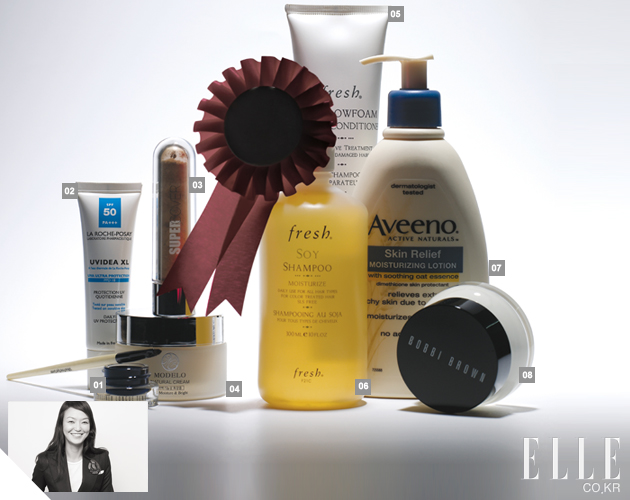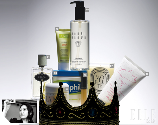 1 프라다 인퓨전 향수, 가격 미정. 몇 년 전 밀란의 프라다 매장에서 막 출시된 이 향수를 테스트해보곤 ‘아, 정말 좋다’고 느끼곤 그냥 돌아섰다. 그로 부터 2년 후 미국에서 우연히 다시 시향해본 뒤 두말 없이 지갑을 열어 열심히 사용하고 있는 제품으로 ‘나와 인연 인 향수’라고 굳게 믿는 중. 파우더리하고 여성스럽지만 흔하지 않은 향으로 아직 국내엔 출시되지 않아 나만의 향 기로 간직하고 싶은 나만의 향수. 2 유리아쥬 이제악 아하 크림, 3만5천원. 아하 성분이 트러블 관리와 각질 제거에 뛰어나다는 것은 잘 알려진 사실. 간혹 민감한 피부일 경우 성분이 잘 맞지 않는 경우도 있는데 유리아쥬 제품은 자극 없이 피부 회복을 도와줘 꾸준히 사용하고 있다. 단 30대를 달려가고 있 는 내겐 건조한 감이 있어 수분 크림과 병행해 사용한다. 3 라 메르 크렘 드 라 메르, 17만5천원. 미국에서 지낼 때 건조, 칙칙함, 좁쌀 여드름 등 온갖 피부 트러블로 고생할 때 당장 백화점에 달려가 구입한 제품. 한국이라면 피부과를 찾았겠지만 어떻게든 셀프 케어로 트러블을 잠재워야 하는 상황에서 ‘기적의 크림’이라는 별 명이 아깝지 않은 크림이다. 향만 맡아도 피부가 진정되는 느낌이 든다. 4 세타필 크림, 가격 미정. 아토피 피부로 고생하는 아이의 엄마들에겐 이미 명성이 자자한 크림으로 드럭 스토어의 칩 & 시크 제품의 대표라 할 수 있다. 매일 온몸에 듬뿍 발라도 6개월을 사용할 정도의 넉넉한 양, 아기에게 사용할 정도로 순한 사용감과 함 께 최고의 보습력까지 갖춘 최고의 보디 크림. 악건성 타입의 얼굴에 발라도 좋다고 하지만 나의 경우에는 뾰루지 를 유발했으니 주의할 것. 5 MAC 셀렉트 모이스처 커버. 2만6천원. 아주 크리미하고 촉촉해 급할 땐 얇게 펴발라 파운데이션처럼 사용하는 전천후 컨실러. 6 바비 브라운 클렌징 오일, 5만8천원. 잠시 한국을 떠나 있던 때, 바비 브라운 클렌징 오일의 폭발적인 인기를 전해듣곤 직접 구입해보곤 ‘역시 한국 여자 의 선택은 진리’임을 새삼 깨달았다. 트러블이 날까 두려워 아직도 클렌징 오일의 세계에 발을 들여놓지 못했다면 주저없이 추천. 언뜻 가격대비 양이 적어 보이지만 경험상 4~5개월은 너끈히 쓸 수 있다. 7 딥티크 VIOLETTE 씬티드 캔들, 7만8천원. 직업상 화장품을 직접 구입할 일은 많지 않지만 그래도 화장품을 구입하는 상황의 절반은 캔들 구입이다. 1만원짜 리부터 브랜드와 숍을 가리지 않고 구입하곤 하는데 그래도 역시 최고의 브랜드는 은은하게 퍼지는 고급스러운 향, 올려만 놓아도 인테리어 효과를 주는 시크한 디자인을 지닌 딥티크! 8 시슬리 스와르 드 륀 보디 크림, 12만원. 촉촉한 보디 피부를 위해 1차적으론 세타필의 크림으로 기본기를 다지지만 가끔 특별한 기분을 내고 싶거나 기분 좋은 향에 취해 숙면을 취하고 싶을 땐 시슬리의 퍼퓸 보디 크림을 사용한다. 상큼하면서도 우아한 향이 ‘여자라서 행복해요’라는 느낌이 절로 들게 하기 때문.