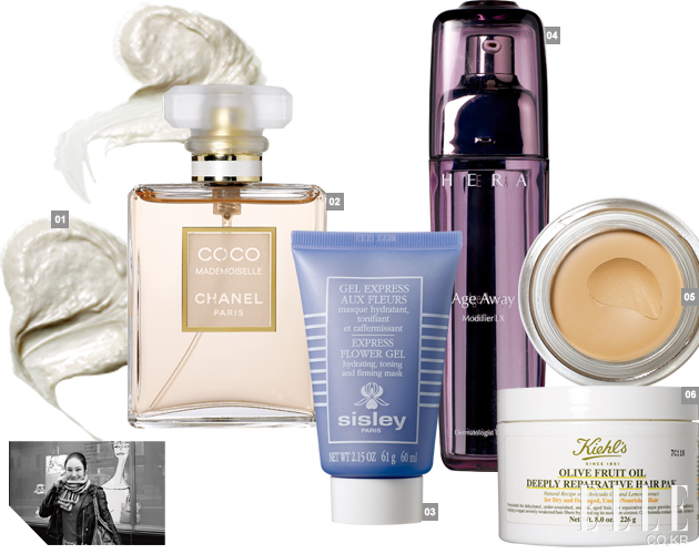 1 MAC 스트롭 크림, 4만4천원. 물광, 윤광 피부가 유행하기 전부터 매끈하고 광택 있는 피부 표현을 즐겼던 내게 스트롭 크림은 오랜 친구 같은 존 재다. 평소엔 이것 하나로 피부 표현을 끝내지만 가끔 메이크업을 할 때도 빼놓지 않고 사용해 파운데이션 전 베이 스 메이크업으로 활용하기도. 2 샤넬 코코 마드모아젤 오 드 퍼퓸, 50ML, 12만8천원. 샤넬 향수의 관능적이고 클래식한 매력과 더불어 현대 여성의 세련됨을 지닌 유니크한 향수. 몇 년 전 샤넬 향수 조 향사를 직접 만난 적 있는데 당시 이 향수에 얽힌 흥미로운 이야기를 많이 들은 터라 더욱 애착이 간다. 3 시슬리 젤 엑스쁘레스 오 쁠뢰르, 13만5천원. 나의 뷰티 예산에서 가장 큰 비중을 차지하고 있는 아이템은 바로 ‘팩’이다. 그 중 몇 통째 꾸준히 사용하고 있는 시 슬리의 수분 팩은 크림-젤 타입으로 피부에 산뜻한 수분감을 공급해줘 애용하는 편이다. 샤워하기 전 듬뿍 바른 뒤 끝날 때 씻어내는 식으로 ‘팩’ 자체의 번거로움을 줄여준다. 4 헤라 에이지 어웨이 모디파이어 LX, 13만원. 이 제품 전에는 국내 브랜드를 한 번도 사용할 기회가 없었던 나의 첫 입성 제품은 헤라의 안티에이징 세럼이었다. 안티에이징 제품은 리치하고 번들거릴 것이라는 생각과는 달리 피부에 싹 스며들면서 보들보들한 감촉 때문에 ‘반 했다’! 다음날 피부 톤이 달라지는 것을 확인하곤 우리나라 사람에겐 자국 브랜드가 맞다는 것을 새삼 실감하기도. 5 MAC 스튜디오 스컬프트 컨실러, 2만6천원. 가끔 뾰루지가 나거나 꼭 감추고 싶은 부위가 있을 땐 파운데이션을 생략하는 대신 컨실러로 국소 부위만 톡톡 찍 어 커버한다. 원래 펜슬 타입을 사용했지만 아쉽게도 더 이상 출시되지 않아 다른 타입으로 대체. 팟 타입의 이 컨실 러는 매끄럽게 발려 뭉치거나 각질이 일어나는 컨실러의 역효과 에도 안심할 수 있다. 6 키엘 올리브 프룻 오일 딥 리페라티브 헤어 팩, 3만5천원. 일반 헤어 제품, 특히 컨디셔너들은 일시적으로 모발이 부드러워졌다고 느껴도 자극적인 화학 성분 때문에 장기적 으론 오히려 독이 된다는 것이 나의 지론. 이 제품은 즉각적인 효과는 미미할지 몰라도 꾸준히 사용할수록 근본적 으로 모발이 재생되는 느낌을 받을 수 있다. 가격대비 양도 넉넉해 일주일에 서너 번씩 열심히 사용한다.