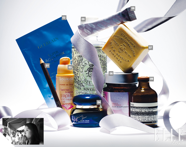 1 로라 메르시에 아이 펜슬 스페셜 브라운, 2만8천원. 메이크업은 눈만 포인트로 하는 편으로 이름 그대로 정말 '스페셜'한 브라운 컬러의 이 펜슬로 그려준 뒤 면봉으로 펴바르면 간단하게 자연스러운 스모키 아이를 연출할 수 있다. 가끔 아이 메이크업을 오래 유지하고 싶을 땐 워터 프루프 타입의 MAC 파워포인트 아이 펜슬을 활용한다. 2 겔랑 수퍼아쿠아 마스크 팩. 15만원. 내 피부에 수분을 부여하는 최고의 팩은 겔랑의 수퍼아쿠아 마스크 팩. 세안 후 얼굴이 붙이기만 하면 되니 번거롭 지도 않다. 특히 나는 얼굴에 붙히고 남은 액을 건조한 다리에 발라주곤 하는데 마치 보디 시머를 바른 듯 윤기가 나는 것을 확인할 수 있을 것. 3 부르조아 꼼 아프레 디제르 드 쏘메이, 3만8천원. 메이크업은 피부 표현마저도 생략하는 편이지만 화장대 한 켠엔 부르조아 파운데이션을 놔두고 필요할 때마다 사 용한다. 마치 10시간 푹 자고 일어난 듯 생기 있는 피부로 만들어준다고 해서 붙여진 이름이라는데 한 번 사용해보 면 고개를 끄덕일 것. 4 미키모토 코스메틱 라페리나 듀 엑스트라 크림, 30만원. 피부에 영양을 준답시고 여러 개를 겹쳐 바르기보단 토너-에센스-크림 정도의 정석 케어가 오히려 피부에 득이 된 다고 생각한다. 단계가 심플한 만큼 좋은 크림 선택이 중요하다. 나는 미키모토의 이 제품으로 수분, 영양, 안티에이 징 등 원하는 모든 기능을 한 번에 해결해 별도의 케어가 필요하지 않을 정도. 매우 쫀득한 텍스처로 얼굴에 착 달 라붙어 탄력과 윤기를 장시간 유지해준다. 5 산타 마리아 누벨라 아쿠아 디 로즈, 5만8천원. 개인적으로 로즈 워터를 좋아해 다양한 브랜드의 것들을 사용해봤는데 이 제품이 단연 최고! 유리병에 들어 있어 진한 로즈 향과 제품의 신선함이 더욱 잘 보존되는 것 같다. 토너용 외에도 목욕 시 입욕제로 첨가해 은은한 향을 즐길 수도 있다. 6,8 미키모토 코스메틱 이너뷰티 파인업 콜라겐, 45포, 8만원 & 프룻 앤 베저테블 엔자임, 17만9천원. 나이가 들수록 이너 뷰티의 중요성을 실감할 수 밖에 없다. 아무리 좋은 크림을 발라도 속부터 건강하지 않으면 제 효과를 발휘할 수 없으니까. 미키모토 코스메틱 매장에서 추천받아 먹어본 이너뷰티 라인은 그런 면에서 아주 만족스런 제품. 독소 제거에 좋은 엔자임과 피부 탄력과 건강한 뼈를 위한 콜라겐 파우더가 나의 추천 아이템. 7 산타 마리아 누벨라 사포네 알 멜로그라노, 3만8천원. 사실 ‘비누’라는 아이템 자체가 여자들의 욕실에서 사라진 지 오래됐지만 19세기 방식으로 만들어진다는 산타마리 아의 이 제품만큼은 여전히 특별하다. 1백% 천연 재료로 처음부터 끝까지 사람의 손에 의해 만들어져 아주 순한 것 이 장점. 아침 세안, 핸드 워시용으로 사용하기에 좋다. 9 에이솝 티트리 리프 페이셜 엑스폴리언트, 3만9천원. 평소엔 에이솝의 퓨리파잉 페이셜 크림 클렌저를 이용해 세안을 하는데 가끔 이것만으론 부족하다 혹은 각질이 쌓 여 얼굴이 칙칙해 보인다 싶을 땐 이 엑스폴리언트를 이용해 각질을 관리한다. 마치 말린 잎처럼 생긴 파우더를 클 렌저에 섞어 마사지하면 자극 없이 묵은 때들이 벗겨지는 느낌.