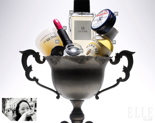 1 숨37 시크릿 프로그래밍 에센스, 8만원. 스킨케어의 필수인 크림마저 끈적이고 답답하다는 이유로 종종 생략하는 내게 ‘산뜻한 마무리감’은 화장품 선택 시가장 중요한 요인 중 하나. 숨37 효자 제품으로 꼽히는 이 에센스는 끈적임 없이 산뜻하게 흡수되면서도 피부 속이 촉촉해진 느낌을 받을 수 있다. 칙칙한 얼굴색 보정에도 효과가 있어 메이크업이 한결 잘 받는 느낌. 2 조르지오 아르마니 쉬어 & 샤인 컬렉션 #8, 3만6천원. 얼굴을 화사하고 어려 보이게 하는 핑크, 코럴 계열의 립 컬러를 즐기는 내게 사랑받는 립스틱. 보기엔 강렬한 핫 핑크로 보이지만 막상 바르면 본래의 입술색과 어우러져 내추럴하게 연출된다. 게다가 놀라울 정도로 촉촉하고 매끄러워 한겨울에도 ‘틴티드 립밤’처럼 사용하기에 좋다. 3 랑콤 잉크 아트라이너 01 블랙 카본 잉크, 3만8천원. 몇 개월 전 <엘르>에서 진행했던 아이라이너 품평기에서 모든 에디터들의 찬사를 독차지했던 아이템. 그 이후에도 여전히 아이라이너의 ‘거성’으로 사랑받는 제품이다. 타 제품과는 차원이 다른 깊은 블랙으로 눈매를 또렷하게 연출 하고 번짐이 없는 것이 장점. 4 D&G 18 LA LUNE, 100ML, 가격 미정. 여성스러움을 베이스로 하되, 유니크한 향을 선호하는 내가 최근 ‘꽂힌’ 향은 D&G의 LA LUNE. 기존의 흔한 플로럴 계열과는 사뭇 다른 미묘하고 유니크한 백합 향으로 종종 “무슨 향수냐?”는 질문 공세를 받곤 한다. 잔향이 연해 사무실에서 기분 전환 겸 가볍게 뿌려주기에도 좋다. 5 로즈버드 살브 립밤, 1만원대. 국내에 정식 론칭되기 전부터 해외 출장 시 꼭 구입하던(선물용으로도 인기 만점이던) 제품이다. 찬바람과 건조한 공기로부터 입술을 보호하듯 얇게 코팅되는 느낌과 인공 향이 배제된 은은한 장미 향, 그리고 넉넉한 양까지 곁에 두고 오래 사용할 수밖에! 6 버츠비 마마 비 너리싱 보디 오일, 2만4천원. 샤워 후 물기가 마르기 무섭게 건조해지는 보디를 위해 물기가 채 마르기 전에 버츠비의 보디 오일을 발라 수분 손 실을 방지한다. 무엇보다 샤워 후의 개운함을 배가해주는 기분 좋은 향이 강추!