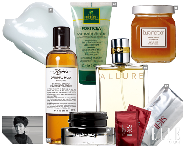 1 샤넬 이드라막스+ 액티브 모이스처 젤 크림, 9만8천원. 상큼한 젤 타입의 수분 크림이지만 한겨울에 보습 케어를 할 수 있을 정도로 깊은 보습력을 가지고 있다. 단순히 수 분을 채워주는 것이 아니라 피부의 유수분 밸런스를 적절히 맞춰주는 느낌이랄까? 덕분에 사계절 내내 나의 보습 케어는 이것 하나로 심플하게 끝! 2 키엘 오리지널 머스크 블랜드 NO. 1 배스 앤 샤워 리퀴드 보디 클렌저, 2만5천원 &보디 로션, 3만1천원. 패션 피플 중엔 유독 키엘의 오리지널 머스크 팬들이 많은데 나도 그들 중 하나다. 사실 머스크는 흔하디 흔한 향이 지만 키엘의 오리지널 머스크만큼 고급스러움과 묘한 섹시함을 표현하긴 쉽지 않다. 샤워 젤과 보디 로션을 함께 사용하면 온몸에 향이 더욱 그윽하게 퍼진다. 아! 물론, 남편과 함께 사용한다. 3 르네 휘테르 포티샤 샴푸, 3만4천원. 사실 덜컥 구입하기엔 가격이 만만찮은 브랜드지만 한 번 경험해보면 또다시 지갑을 열 수밖에 없다. 특히 포티샤 샴푸는 힘 없는 모발에 탄력을 주고 두피를 시원하게 해준다. 단, 건조한 두피와 모발이라면 자극적일 수도 있으니 사용 횟수를 잘 조절해서 사용할 것. 4 샤넬 알뤼르 오 드 뚜왈렛, 50ML, 9만1천원. 나의 뷰티 사전에 향수는 오직 하나다. 갑갑한 지하 스튜디오에서 일할 때도, 절친들과 모임을 가질 때도, 늦은 저녁 파티에서도 절묘하게 상황과 어우러지는 샤넬의 알뤼르가 그것. 몇 년을 매일 사용해도 질리지 않는 나의 시그너처 향수. 5 로라 메르시에 허니 배스, 5만2천원. 보디 제품은 사도 사도 욕심이 생겨 시시때때로 셀렉션이 바뀌는 나의 욕실 한 켠을 변함없이 지키고 있는 아이템. 냄새만 맡아도 온몸이 노곤노곤해지는 따뜻한 허니 향으로 두어 스푼 덜어 따뜻한 물에 섞어 목욕을 즐기면 하루의 피로가 싹 가시는 느낌을 받을 수 있다. 6 MAC 플루이드 라인 블랙 트랙, 2만6천원. 메이크업 제품보다 스킨, 보디 케어에 관심이 더 많지만 MAC의 젤 아이라이너만큼은 예외다. 스케줄에 쫓겨 화장을 전혀 하지 않은 날이라도 이 아이라이너만 살짝 그려주면 피곤함과 초췌함을 감출 수 있기 때문. 다른 색조 메이크 업을 하지 않은 내겐 블랙 컬러가 안성 맞춤. 7 SK2 화이트닝 소스 덤 리바이벌 프로그램, 11만원. 누군가 내게 ‘팩’ 추천을 물어오면 1초의 망설임 없이 대답하는 나의 베스트 아이템. 얼굴 전체에 사용하는 마스크 6 매와 고민되는 부위에 집중적으로 사용할 수 있는 필름 28개가 함께 구성돼 있는데, 필름이 바로 추천 이유! 스물스 물 올라오는 기미나 잡티 부위에 필름을 붙인 뒤 마스크를 덧씌우면 필름이 녹아 피부에 흡수되는데, 다음날 확실 히 문제 부위가 옅어지는 것을 눈으로 확인할 수 있다.