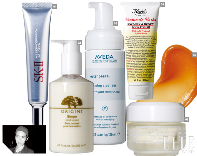 1 SK2 화이트닝 소스 덤 데피니션 UV 로션, 7만3천원대. 자외선 차단제의 중요성은 익히 들어 알고 있는 터. 그래도 간혹 흐린 날엔 빼먹곤 하지만 SK2의 이 제품을 매일 사 용하려고 노력한다. 다른 제품들은 백탁 현상이 심하거나 시머, 메이크업 효과가 있어 바르기 꺼려지는데 이 제품은 로션처럼 가볍게 사용할 수 있어 제격이다. 2 오리진스 진저 핸드 로션, 2만5천원. 사실 남자에게 핸드 로션이란 가끔 귀찮은 존재다. 이 제품은 대용량에 펌프 타입이라 테이블에 두고 오며 가며 생 각날 때마다 꾹꾹 눌러 사용할 수 있어 ‘핸드 케어 촉진’을 부르는 아이템. 은은한 진저 향도 자꾸 손이 가는 이유 중 하나. 3 아베다 아우터 피스 포밍 클렌저, 3만8천원. 건조하고 예민한 피부라 웬만한 클렌저는 세안 후 모두 당기는 느낌을 받는데 이 제품은 촉촉하게 마무리돼 추천. 블레미시 케어 전용 라인이라 각질과 모공 관리에도 효과적이다. 저절로 거품이 나는 펌프형 폼 타입이라 사용도 간편하다. 4 키엘 크렘 드 꼬르 소이 밀크 앤 허니 보디 폴리쉬, 3만4천원. 1주~10일에 한 번 정도 사용하는 보디용 스크럽. 혹 거친 알갱이들이 피부에 자극을 주지는 않을까 하는 우려와 달 리 다리를 몇 번 문지르고 나면 몰라보게 매끈해진 피부로 변신해 있다. 무엇보다 체감 온도를 올리는 듯한 따뜻한 꿀 & 우유 향이 즐거운 배스 타임을 도와준다. 5 엘리자베스 아덴 에잇 아워 크림, 2만5천원. 일반인들은 잘 모르는 패션, 뷰티 피플들의 비밀 병기 중 하나. 미국판 ‘호랑이연고’라 할 수 있을 정도로 활용도가 높은 만병통치 아이템이다. 나는 해외 출장 시 건조한 호텔 공기 때문에 간혹 트러블이 생기곤 하는데 염려가 되는 부위에 이 크림을 바르고 자면 미리 불상사를 막을 수 있다. 단, 무척 끈적이므로 아침에 사용하는 것은 피할 것. 6 시슬리 보므 에휘까스, 13만원. 아이 케어에 특히 신경을 쓰는 편이라 아침, 저녁용 아이 제품을 따로 사용한다. 시슬리의 이 투명한 아이 젤은 저녁 에 사용하는데 상쾌한 텍스처와 향을 지녀 하루 종일 지친 눈가의 피로를 해소해준다. 아침에 눈이 부었을 때 도톰 히 발라 팩처럼 사용하면 부기 해소에도 탁월하다.