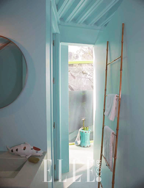 아쿠아 블루 컬러로 지중해의 물빛을 담은 욕실.