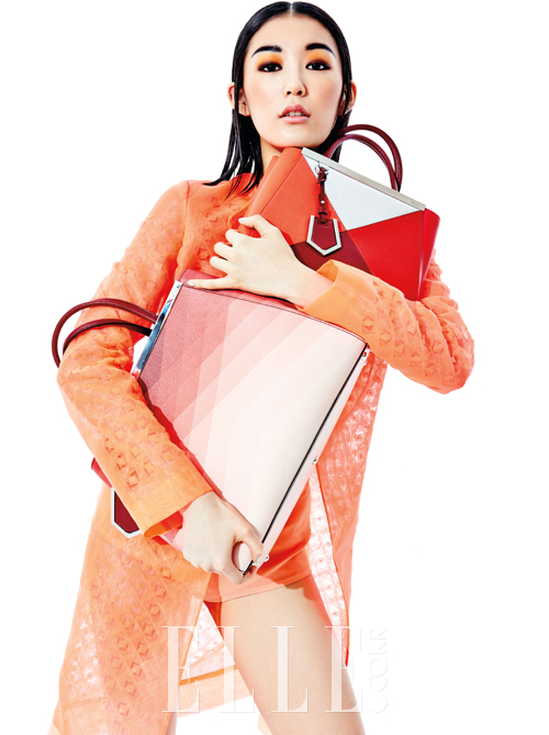 피치 컬러의 브리프와 시스루 재킷은 모두 가격 미정, 레드와 실버 컬러가 대비되는 프티 투 주르 백은 2백64만원, 레드 컬러가 그러데이션된 투 주르 백은 3백82만원대, 모두 Fendi