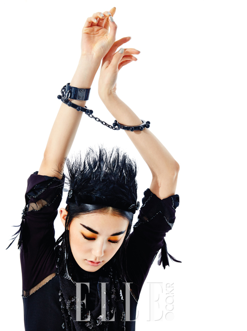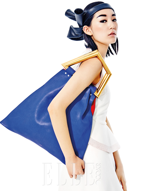 레더 소재의 화이트 드레스는 가격 미정, 블랙 헤드피스는 1백만원대, 모두 Balenciaga. 두툼한 골드 손잡이가 존재감을 드러내는 백은 가격 미정, Celine.