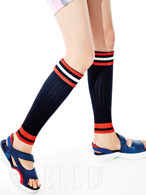스트라이프 레그 워머는 가격 미정, 네이비 컬러의 스포츠 샌들은 88만원, 모두 Prada.