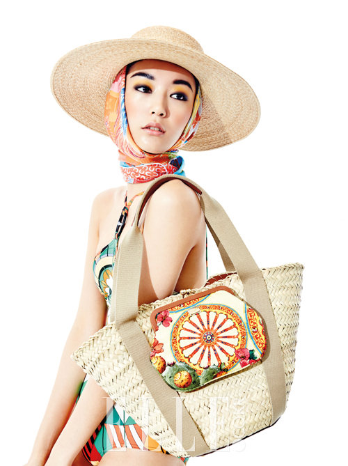 스카프 패턴의 스윔수트와 오렌지 컬러 스카프, 라피아 햇은 모두 가격 미정, Hermes. 동전 지갑 모양의 포켓 디테일 비치 백은 2백87만원, Dolce & Gabbana.