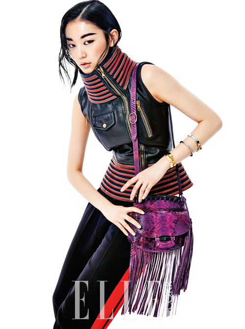 아프리카 모티프의 지퍼 장식 베스트와 레드 스트라이프 팬츠는 모두 가격 미정, Alexander McQueen. 퍼플 컬러의 엑조틱 레더 소재 누보 프린지 숄더백은 4백80만원대, Gucci. 미니멀한 브레이슬렛은 각각 1백만원대, Saint Laurent.