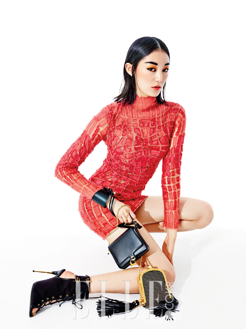 핑크 컬러의 드레스는 가격 미정, 손목에 고정시키는 브레이슬렛이 연결된 클러치백은 가격 미정, 섹시한 레이스업 부티는 2백10만원으로 모두 Tom Ford. 태슬 장식의 미니백은 가격 미정, Alexander McQueen.