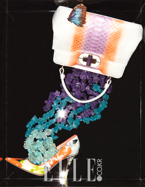 오키드와 나비가 있는 인상주의 정물. 마치 스프레이를 뿌린 듯 오묘한 컬러 그러데이션이 돋보이는 파이톤 토트백은 4200유로, Bulgari. 오키드 프린트가 스탬프처럼 찍힌 패턴의 펌프스힐은 425유로, Jimmy Choo.