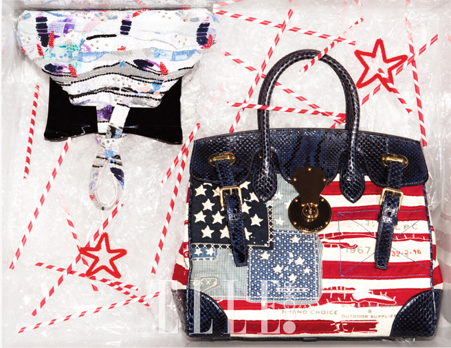 팝 아트 화가 재스퍼 존스를 오마주한 팝 아트 작품. 파이톤에 칸버스가 패치워크된 토트백은 3500유로, Ralph Lauren  Collection. 비즈와 스팽글이 수놓인 실크 소재 클러치는 2600유로, Giorgio Armani.