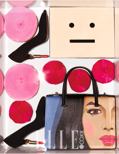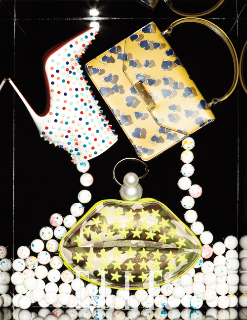 만 레이의 입술을 연상시키는 클러치백과 픽셀 아트 백 등으로 완성한 울트라 팝아트. 컬러풀 스터드 부츠는 1465유로, Christian Louboutin. 하트 프린트 토트백은 가격 미정, Gucci. 입술 모양의 클러치백은 115유로, Mia Bag. 볼드한 진주 장식의 브레이슬렛은 970유로, Chanel.