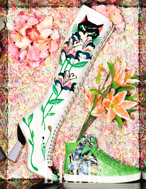 꽃과 고양이 모티프의 자연주의 작품. 식물 프린트의 레이스업 부츠는 가격 미정, Miu Miu. 타투 프린트 장식의 하이톱 스니커즈는 298유로, Hogan Rebel.