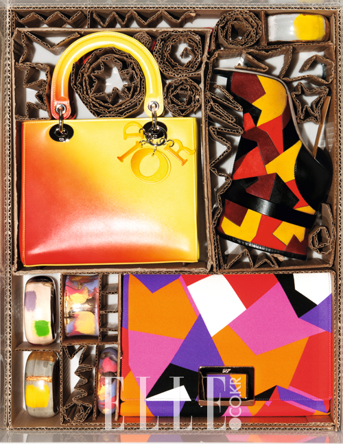 칸딘스키의 추상화를 연상시키는 패치워크와 컬러 베리에이션. 스프레이로 컬러 그러데이션을 연출한 듯한 토트백은 가격 미정,  Dior. 멀티 컬러 송치 패치워크 부츠는 1590유로, Sergio Rossi. 모던 아트 프린트의 클러치백은 1250유로, Roger Vivier. 핸드프린팅한  둥근 뱅글은 각각 150유로,  Donatella Pellini.