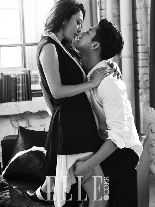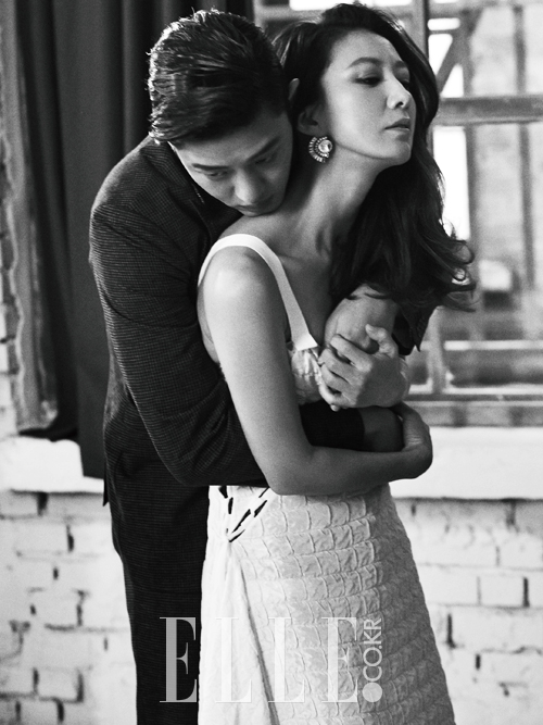 유래 없이 드넓은 스튜디에 영화 조명팀과 세트 팀까지 가세한 거대한 스케일의 <엘르> 화보 촬영현장. 스타일링 팀과 에디터, 매니저들까지 40명이 넘는 인원이 지켜보는 가운데 포즈가 아닌 연기를 펼치는 두 배우가 있다. 거침없는 스킨십을 이어가는 그들의 아찔한 순간순간들을 보고 있노라니 이곳이 화보 촬영현장인지 영화 촬영현장인지 하는 의문도 든다. 배우 김희애가 “다른 세대의 사람들이 만난 일종의 교통사고 같은 이야기”라고 표현한 Jtbc 드라마 <밀회>의 두 주인공은 어느덧 서로에게 익숙해진 듯 아무렇지 않은데 보는 이들의 마음은 두근두근거린다. “이건 파격이라기보다는 일상”이라고 자신 있게 얘기하던 포토그래퍼 홍장현의 얼굴이 결국 붉게 물든 건 결과물이 빚어낼 카타르시스를 이미 체험하고 있기 때문인지도 모르겠다. 이 스페셜한 프로젝트, 그러니까 김희애와 유아인이라는 두 배우를 만나기까지 <엘르>는 16부작 드라마가 별다른 사고 없이 방영되었을 두 달의 기간이 걸렸다. 솔직히 말하면 그간 우린 이렇게까지 드라마틱한 촬영현장을 기대하지 못했다. 그래서 첫 컷부터 폭발한 그들의 연기에 잠시 당황했다. 이후 자연스럽게 컷 수가 늘어났고 유례 없는 30쪽짜리 화보가 탄생했다. 총총총, 연기를 끝낸 김희애는 수줍게 걸어가며 먼 발치에서 모니터를 훔쳐본다. 반면 뚜벅뚜벅, 유아인은 아무렇지 않게 걸어와 모니터에 띄워진 이미지들을 휴대폰으로 근접 촬영한다. 이 극단적 행동만큼 세대도 성격도 전혀 다른 두 사람이 한 호흡이 된 화보 촬영은 6시간 만에 끝이 났다. 드디어 막혔던 말문이 트였고 먼저 소개하는 이는 반전의 주인공이자 제8의 전성기에 오른 김희애다.