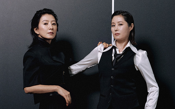김희애의 블랙 컬러 베스트 형식의 벨티드 원피스는 Lanvin. 유아인의 화이트 셔츠와 블랙 팬츠는 모두 Lanvin Men.