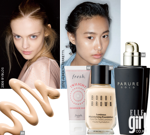 glossy skin 베이스 메이크업은 피부의 질감 처리에 따라 트렌드가 좌우되는데, 매트하고 보송보송한 피부를 강조했던 작년과 달리 올해에는 광택이 흐르는 환하고 깨끗한 피부가 주목 받을 예정이다. 가장 좋은 연출 방법은 비비 크림만 얇게 발라도 윤기가 감도는 건강한 피부를 유지하는 일이겠지만, 그렇지 못할 때는 시머가 함유된 촉촉한 파운데이션이 도움이 된다.