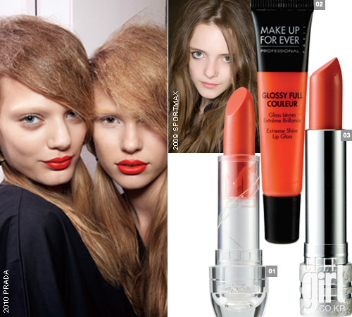 orange lipstick 작년 상반기에 인기몰이를 했던 립스틱 컬러는 단연 딸기우윳빛 핑크! 하지만 올해에는 진하고 상큼한 오렌지 컬러 립스틱을 더욱더 눈여겨봐야 할 듯하다. 피부색이 노란 사람들의 경우, 밝고 비비드한 색감보다 붉은색이 가미된 오렌지색을 선택하여 글로시하게 연출하는 것이 성공 노하우. 그리고 피부 톤은 최대한 맑고 깨끗하게 연출해야 실패할 확율이 낮아진다는 사실도 염두에 두자.