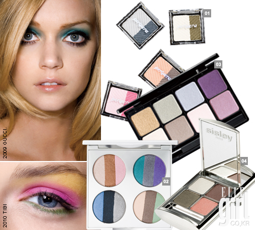 1 볼드 뷰티풀 아이섀도 팔레트. 10.4g. 5만원. 스틸라. 2 더블 샤인 섀도우 2, 7, 8, 9호. 2.5g. 각각 7천원대. 페리페라. 3 주얼 팔레트 09, 402, 406, 408, 216, 401, 404, 409호. 1.8gX4. 각각 8만8천원. 비디비치 by 이경민. 4 팔레트 휘또 스타아이즈 이리디슨트 아이섀도. 1gX4. 12만5천원. 시슬리.