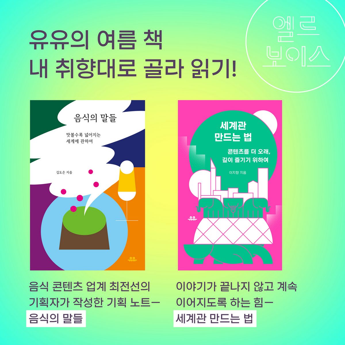 뉴스레터, 브랜드, 서비스, 책, 전시, 공간까지 엘르보이스가 눈여겨보는 다양한 이야기를 전하는 보이스 초이스 및 신간 기대평 이벤트를 진행했습니다. 엘르보이스 #69 내가 좋아하는 우리 동네 - [보이스 초이스] - 『음식의 말들 & 세계관 만드는 법』